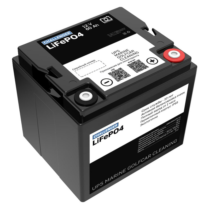 Литий-ионный (LiFePO4) тяговый аккумулятор Challenger 12-60 LFP производится напряжением 12 В и ёмкостью 60 Ач. Главная особенность батареи — продолжительный срок службы, в циклическом режиме он превышает 2000 циклов заряда-разряда при DOD = 80%. Также акб подходит для работы при температуре от -20 до +60 °C. Герметичный корпус выполнен из прочного ABS-пластика и обеспечивает уровень пылевлагозащиты IP65. Challenger 12-60 LFP - это универсальный тяговый аккумулятор, который подойдёт для водного транспорта, электромобилей, альтернативной энергетики, источников бесперебойного питания, систем безопасности и сигнализации, систем связи, медицинских учреждений, а также для поломоечной техники. Батарея защищена от перезаряда, глубоких разрядов, коротких замыканий, высоких и низких температур.