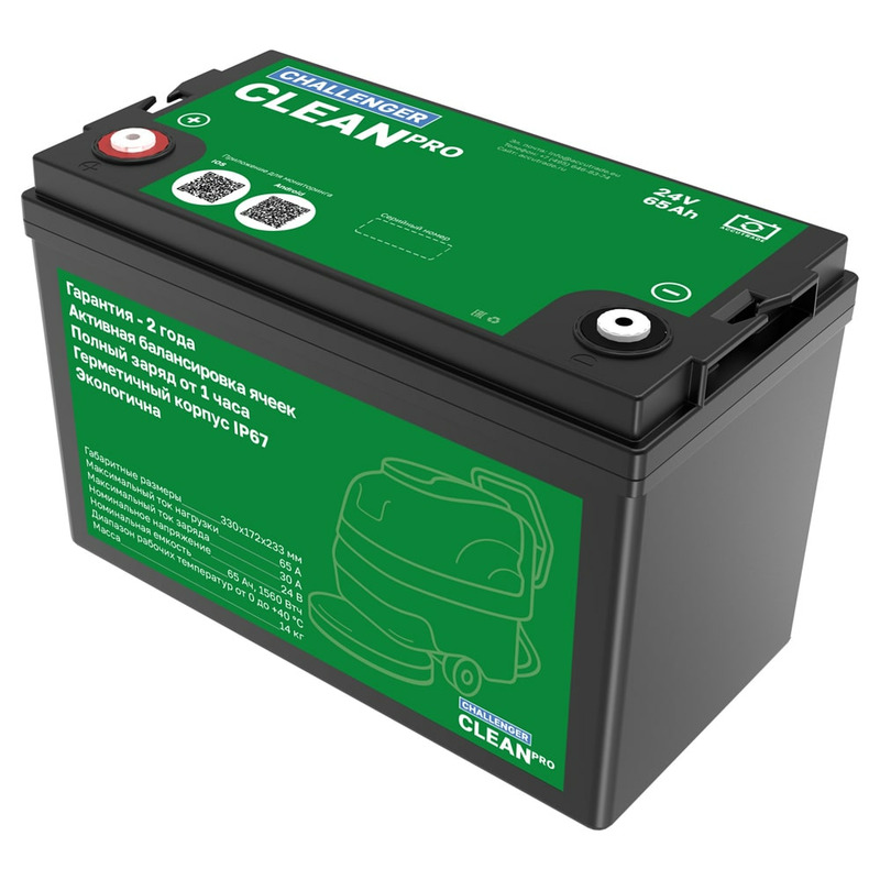 Литий-ионный (LiFePO4) тяговый аккумулятор Challenger Clean PRO 24-65 производится напряжением 24 В и ёмкостью 65 Ач. Главная особенность батареи — продолжительный срок службы, в циклическом режиме он превышает 3000 циклов заряда-разряда при DOD = 80%. Также акб поддходит для работы при температуре от -20 до +60 °C. Герметичный корпус выполнен из прочного ABS-пластика и обеспечивает уровень пылевлагозащиты IP65. Challenger Clean PRO 24-65 - это универсальный тяговый аккумулятор, который подойдёт для водного транспорта, электромобилей, альтернативной энергетики, источников бесперебойного питания, систем безопасности и сигнализации, систем связи, медицинских учреждений, а также для поломоечной техники. Батарея защищена от перезаряда, глубоких разрядов, коротких замыканий, высоких и низких температур.
