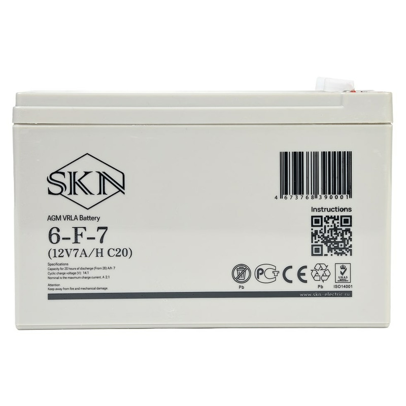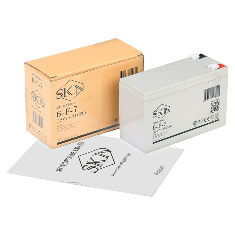 Аккумуляторная батарея SKN 6-F-7 разработана с применением технологии AGM и оснащена усиленными свинцовыми пластинами, разделёнными плотным сепаратором. Эта батарея не требует обслуживания на протяжении всего срока эксплуатации. Она отлично подходит для использования в системах безопасности и сигнализации, источниках бесперебойного питания, аварийного освещения, а также в лёгком и детском электротранспорте и других схожих областях.
