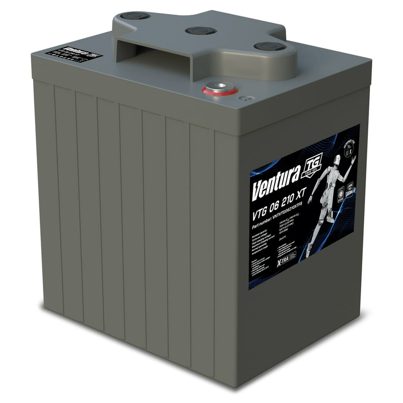 Премиальный тяговый аккумулятор Ventura VTG 06 210 XT напряжением 6 В ёмкостью 184 Ач производится по технологии TRUE GEL (TRUE GEL X-TRA) с применением улучшенной конструкции с усиленными решётками. Главная особенность серии — съёмные конусные выводы A-POL, позволяющие легко менять тип клемм на резьбу под болт. Электролит находится в загущенном желеобразном состоянии, что обеспечивает повышенную надёжность, устойчивость к вибрациям, перепадам температур и глубоким разрядам. Тяговая гелевая батарея Ventura VTG 06 210 XT подходит для работы как в буферном режиме, так и в циклическом, обеспечивая до 15 лет работы или 1500 циклов заряда-разряда. Аккумулятор надёжно герметизирован и защищён от проливания. На крышке ударопрочного корпуса располагаются высококлассные клапаны избыточного давления (VRLA), которые гарантируют безопасную работу и транспортировку в любом положении. Обслуживание на протяжении всего срока службы тягового гелевого акб не требуется. Благодаря низкому % саморазряда Ventura VTG 06 210 XT может храниться без подзарядки до 2 лет.
