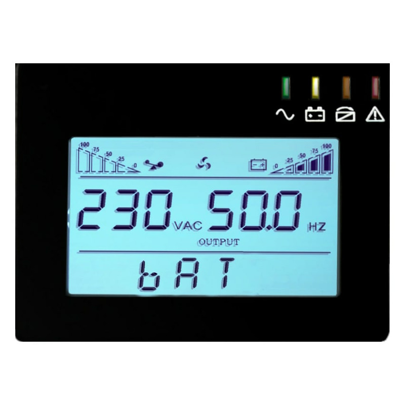 Вывод информации - параметры работы: напряжение, частота, уровень нагрузки, температура, уровень заряда батарей. Включение/выключение системы.