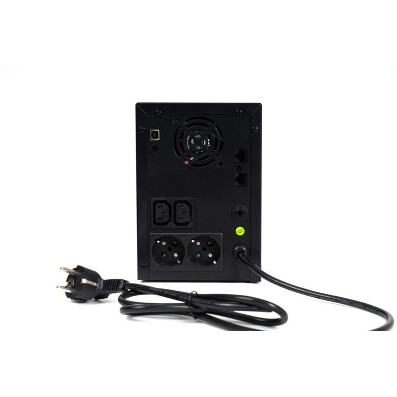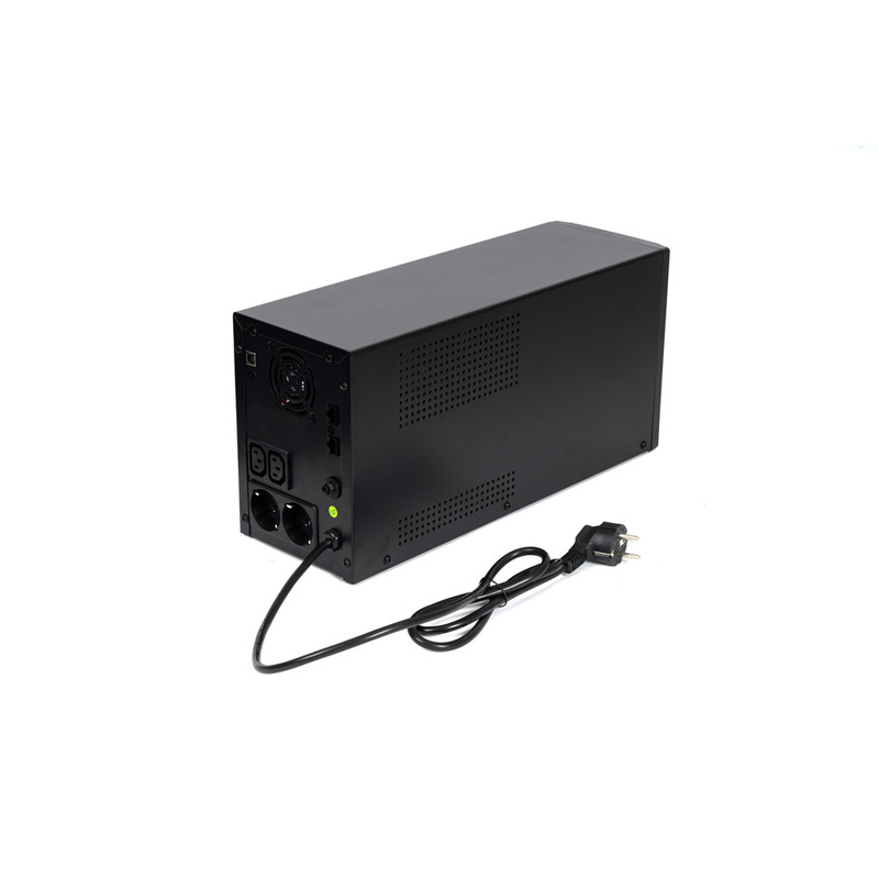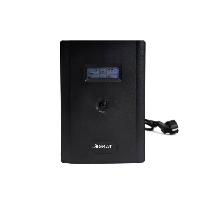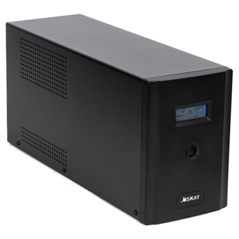 ИБП SKAT-UPS 3000/1800 - 220 В, 3000 ВА, (1800 Вт), встроенный АКБ 9 Ач, 4 шт, время резерва 2 мин., холодный старт, модифицированый синус, световая и звуковая индикация режимов работы, графический дисплей режимов работы связь и управление ПК по USB. Встроенный стабилизатор (диапазон сети 162—290 В), защита от всплесков напряжения, защита от перегрузки. 4 выходных разъема: 2 шт. IEC 320 C13 (компьютерный), 2 шт. CEE 7/4 (розетка с заземлением)