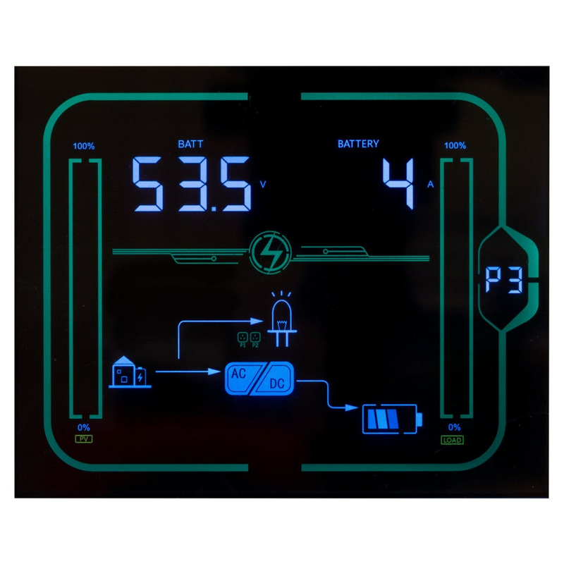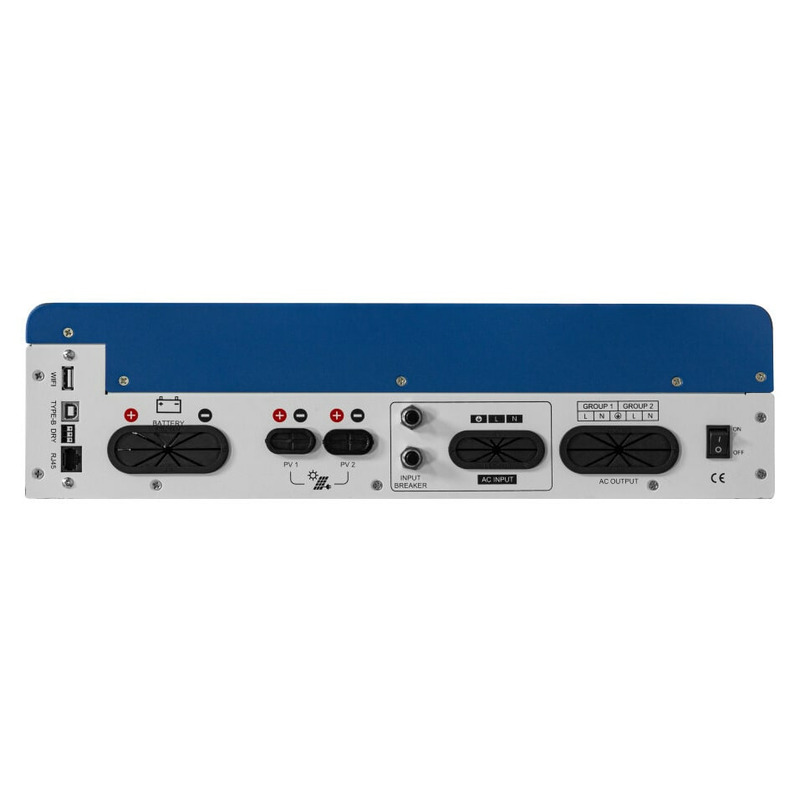 - Имеет встроенный двойной высокоэффективный MPPT HV контроллер для зарядки от солнца (2*100 А, макс. 2*6000 Вт)
