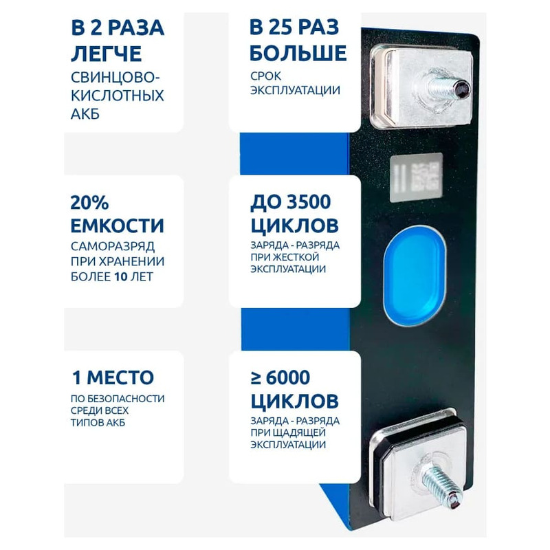 • Высокая плотность энергии по сравнению со свинцово-кислотными АКБ