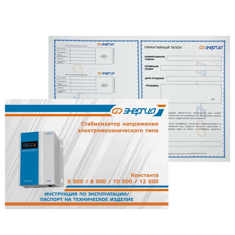Электромеханический стабилизатор напряжения Энергия Константа предназначен для стабилизации напряжения в бытовой сети электроснабжения. Высокое качество сборки является гарантией длительной и безотказной работы стабилизатора. Выходное напряжение стабилизатора поддерживается в диапазоне 230 В ± 3 %, что соответствует требованиям на предельно допустимые значения отклонения напряжения электропитания по ГОСТ 13109–97 «Нормы качества электрической энергии в системах электроснабжения».