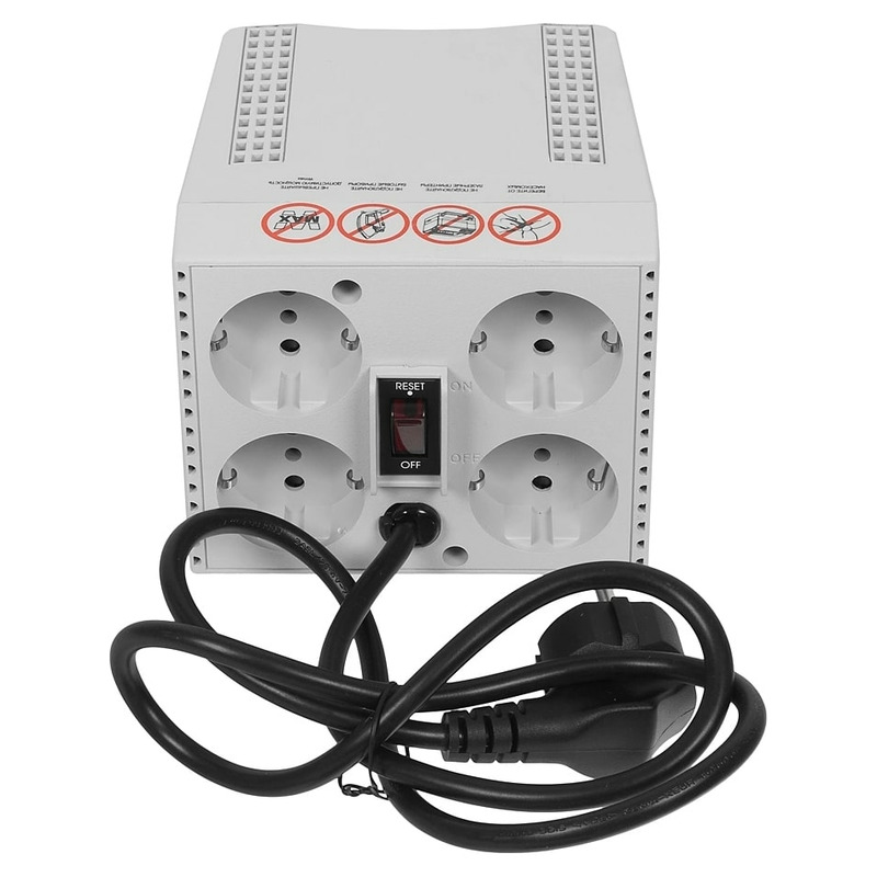 Бытовые стабилизаторы напряжения серии ТСА обеспечивают надежную работу компьютерной и прочей электронной техники при понижении или повышении напряжения электросети там, где не требуется батарейная поддержка. Компактный корпус стабилизатора вмещает 4 выходные евророзетки с заземлением (4 x CEE 7/4) на задней панели с защитой от проникновения посторонних предметов и надежной фиксацией вилок любых типов. Для защиты от перегрузки и короткого замыкания на выходе предусмотрен автоматический выключатель. После устранения причины проблемы выключатель легко возвращается в исходное состояние одним нажатием.