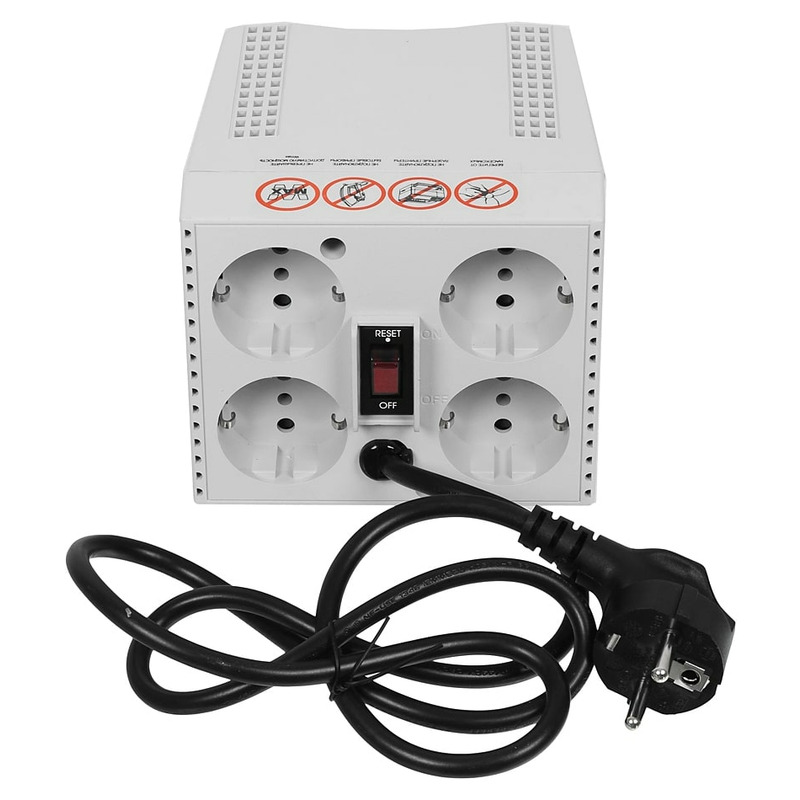 Бытовые стабилизаторы напряжения серии ТСА обеспечивают надежную работу компьютерной и прочей электронной техники при понижении или повышении напряжения электросети там, где не требуется батарейная поддержка. Компактный корпус стабилизатора вмещает 4 выходные евророзетки с заземлением (4 x CEE 7/4) на задней панели с защитой от проникновения посторонних предметов и надежной фиксацией вилок любых типов. Для защиты от перегрузки и короткого замыкания на выходе предусмотрен автоматический выключатель. После устранения причины проблемы выключатель легко возвращается в исходное состояние одним нажатием.