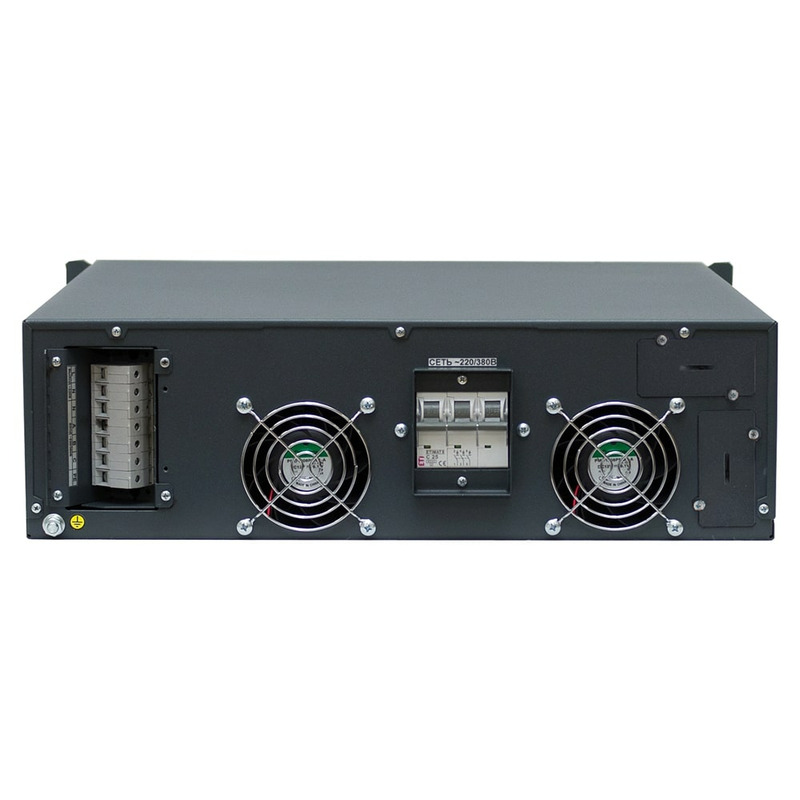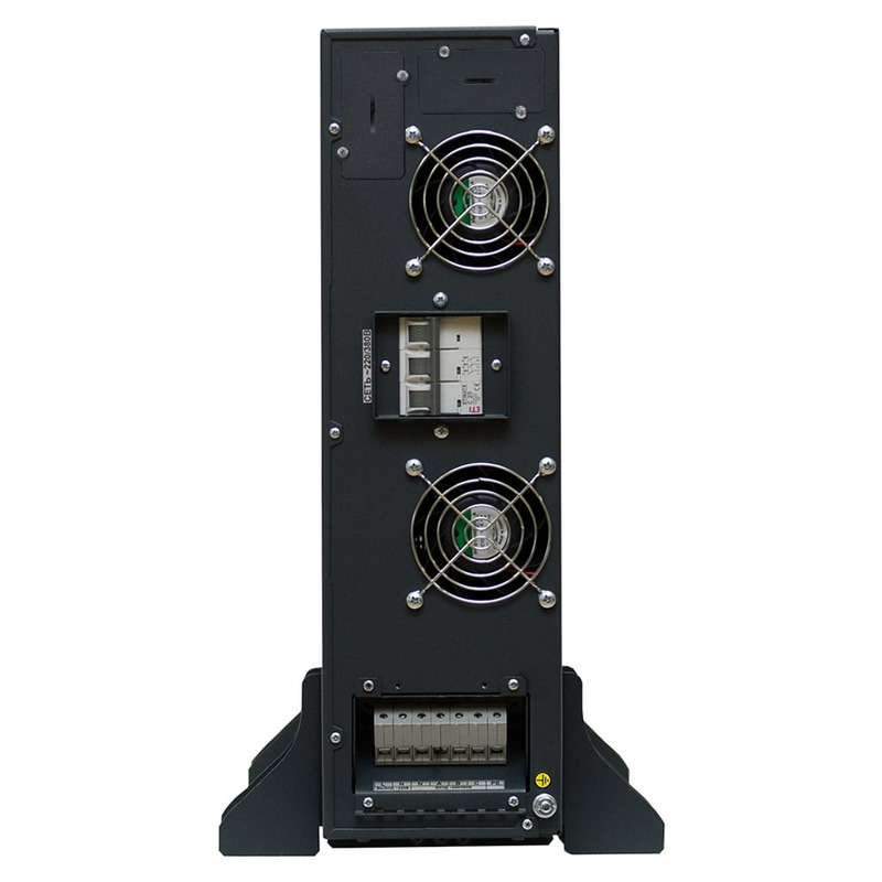 На передней панели устройства расположены четыре светодиодных индикатора («Сеть», «Выход», «Байпас», «Авария») и цифровой ЖК-дисплей для просмотра параметров работы (состояния входной и выходной сети, мощности нагрузки, температуры внутри стабилизатора и др.) и конфигурации, в том числе выбора значения выходного напряжения и режима работы (стандартный, ECO/байпас). Для подключения к сети электропитания и подключения нагрузки используются клеммная колодка и вводной автомат, расположенные на задней панели стабилизатора. Там же находятся два слота для опциональной установки карт мониторинга.